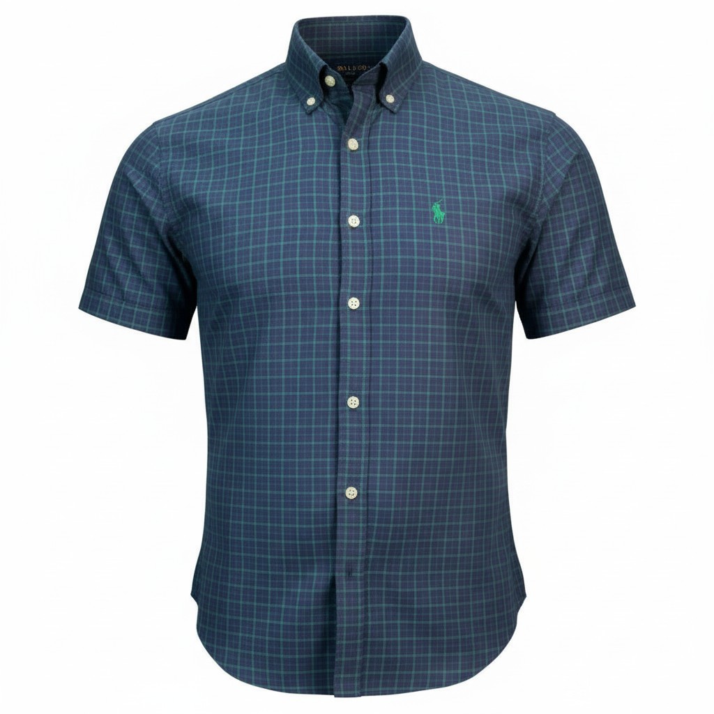 Camisa RL Masculina Custom Fit Manga curta Xadrez Azul e verde