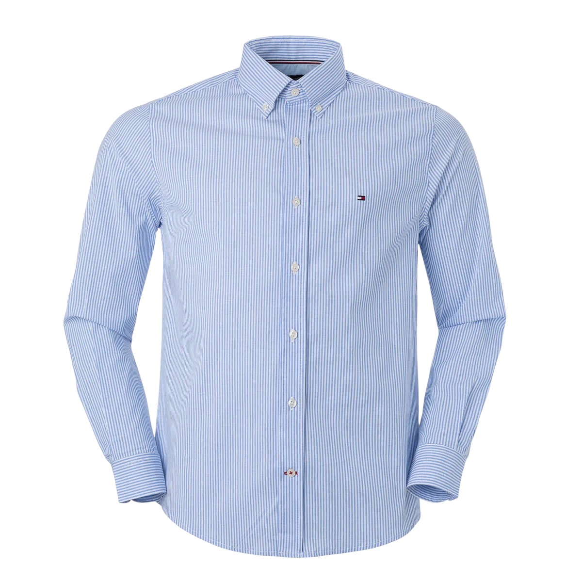 Camisa Tommy Hilfiger manga longa no modelo listrada na cor azul claro.