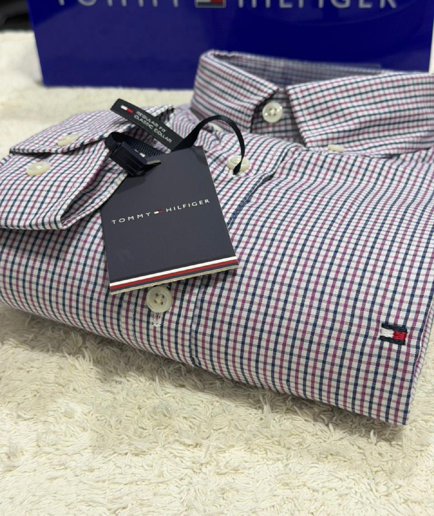 Camisa Tommy Hilfiger manga longa no modelo xadrez na cor rosa e azul.