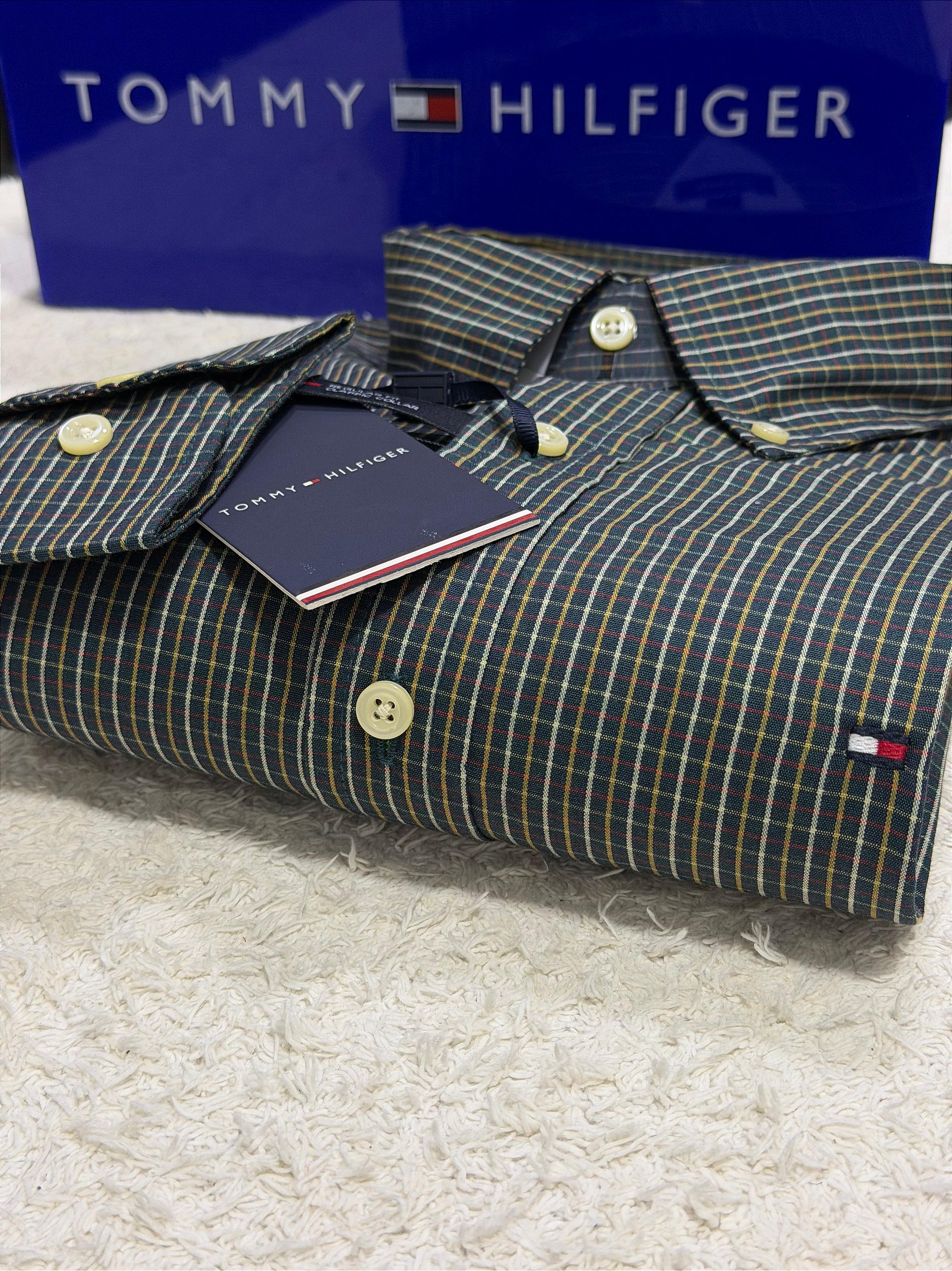 Camisa Tommy Hilfiger manga longa no modelo xadrez na cor verde e dourada.
