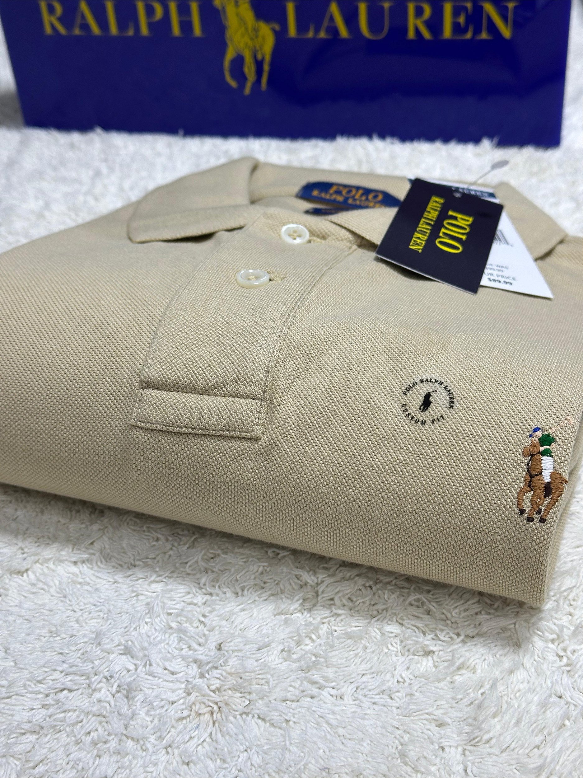 Parte posterior mais alongada, característica tradicional das polos da Ralph Lauren.